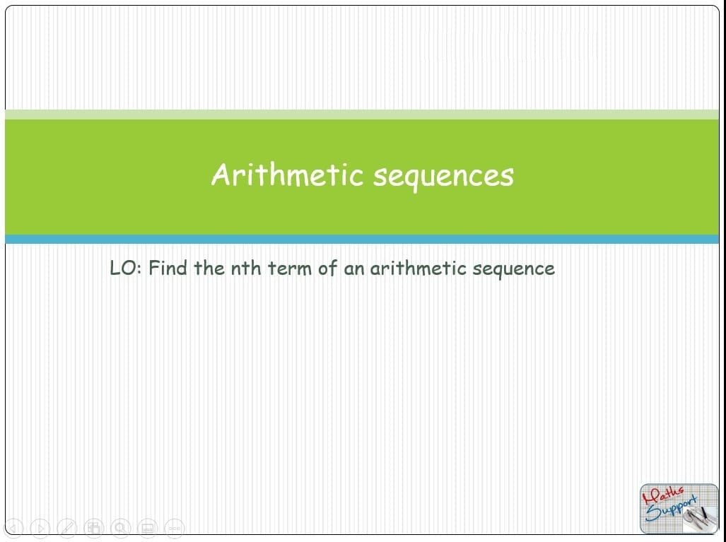 Description: Supporting Maths teachers with our comprehensive PowerPoint presentation dedicated to exploring arithmetic sequences. This dynamic resource serves as an instructive tool, meticulously crafted to guide students through identifying arithmetic sequences, deriving the crucial formula for the nth term, and effectively applying it to find the nth term in any arithmetic sequence.
