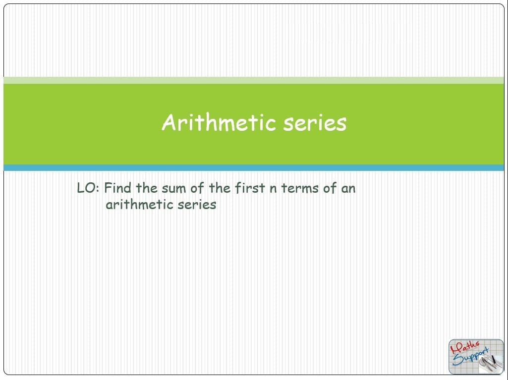 Description: A comprehensive PowerPoint presentation designed for Maths lessons, focusing on arithmetic series. This meticulously designed resource is dedicated to unraveling the intricacies of finding the sum of the first n terms of an arithmetic series, presenting two formulae for calculating arithmetic series.