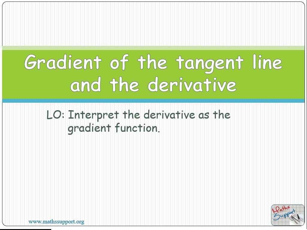 Power point presentation, 11 slides Explaining how to find the gradient of the tangent at any point on the function, and from there explains the meaning of the derivative and how to get the derivative of a function from first principle, based on the Maths IB Analysis and approaches syllabus.