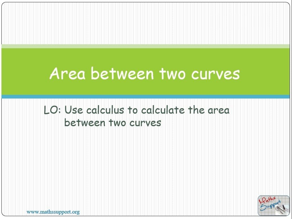 Power Point presentation, 16 slides, Explaining how to calculate the area between two curves using integrals and how to use the GDC (Graphic display calculator) to find the area, based on the Maths IB Analysis and approaches Syllabus.